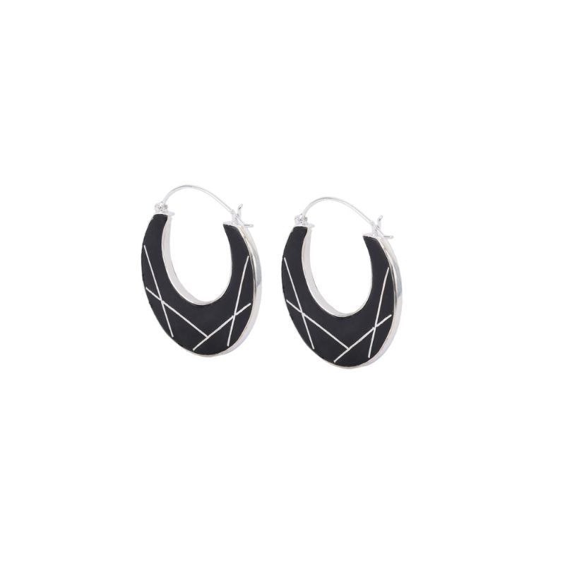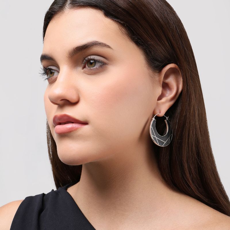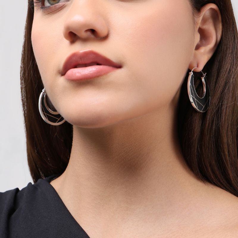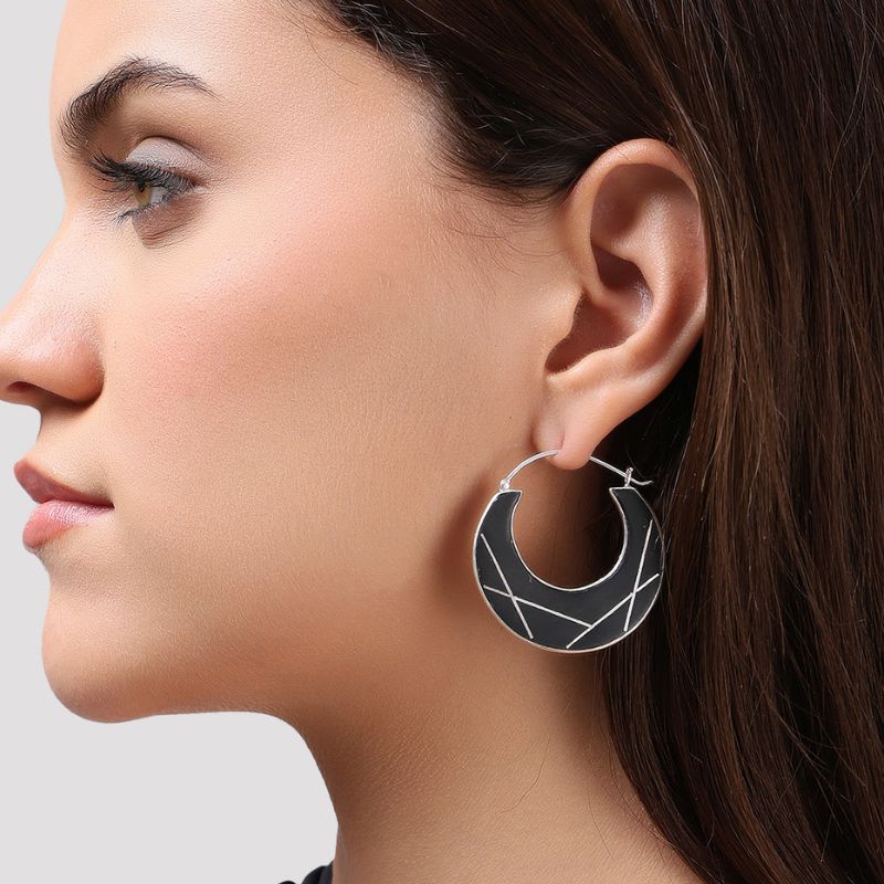 The Sitara Chandra Hoops draws from the calm presence of the moon — steady, luminous, and timeless. Handcrafted using traditional Bidri techniques, inlaid with fine silver lines, echoing abstract constellations.